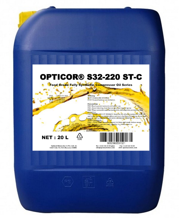 OPTICOR ® AIR COMP S32-220 ST-C, en yüksek kalitede polialfaolefin (PAO) baz yağlarından formüle edilmiş, biyolojik olarak parçalanabilir gıda sınıfı, üstün tescilli katkı maddesi paketiyle uzun ömürlü kullanım sağlayan tamamen sentetik kompresör ve vakum pompası yağlayıcı serisidir.