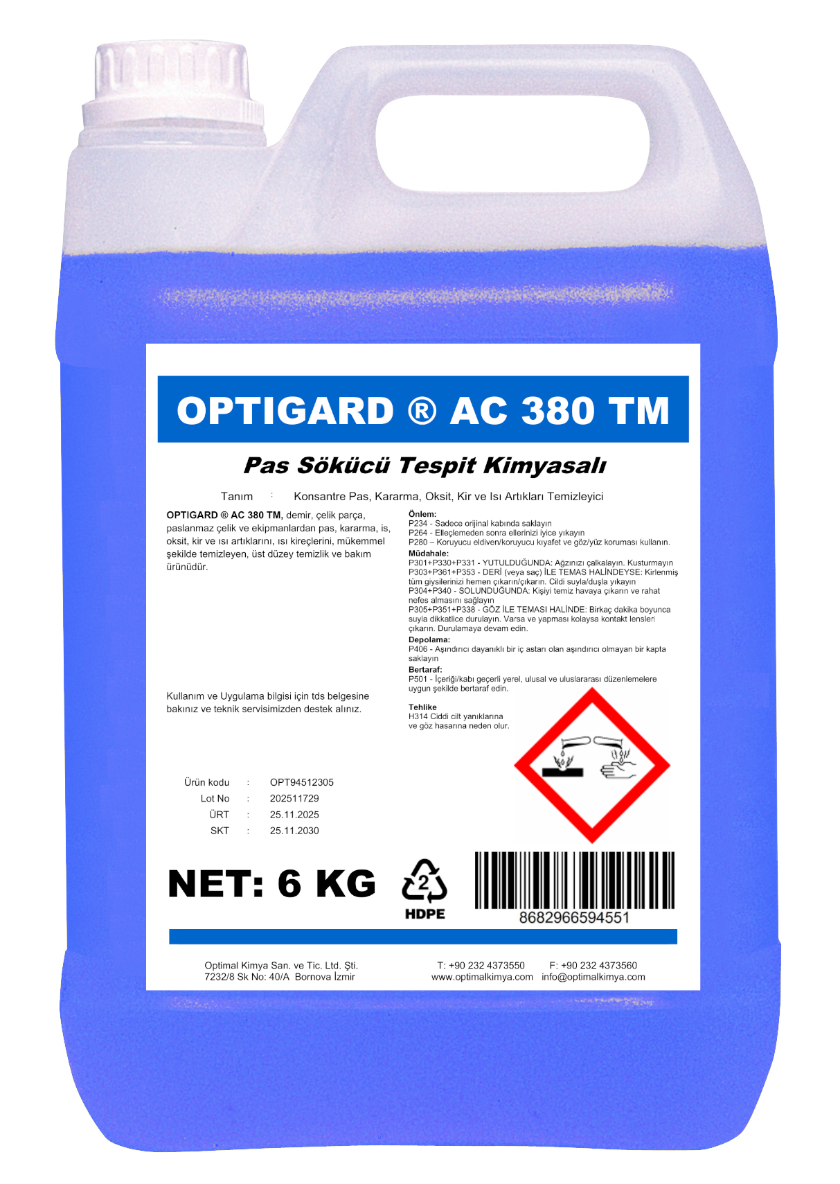 OPTIGARD ® AC 380 TM, performans artırıcı özel asidik bileşenler, uçucu olmayan mineraller, korozyon önleyiciler, yüzey aktifler, emülgatörler ve dağıtıcı ajanlar içeren; demir, çelik parça, paslanmaz çelik ve ekipmanlardan pas, kararma, is, oksit, kir ve ısı artıklarını, ısı kireçlerini, mükemmel şekilde temizleyen, üst düzey temizlik ve bakım ürünüdür.