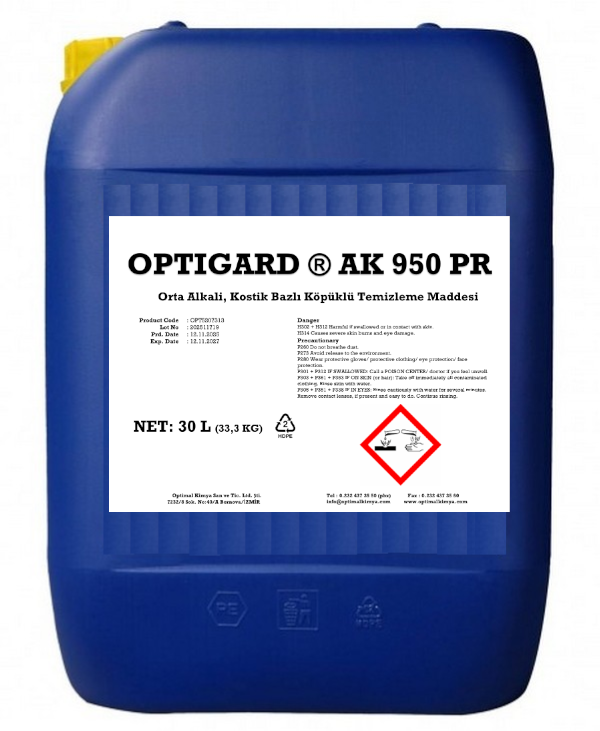 OPTIGARD ® AK 950 PR, orta derecede alkali, kostik bazlı, çok amaçlı, köpüklü, ağır yağ ve kir çözücü temizlik maddesidir.