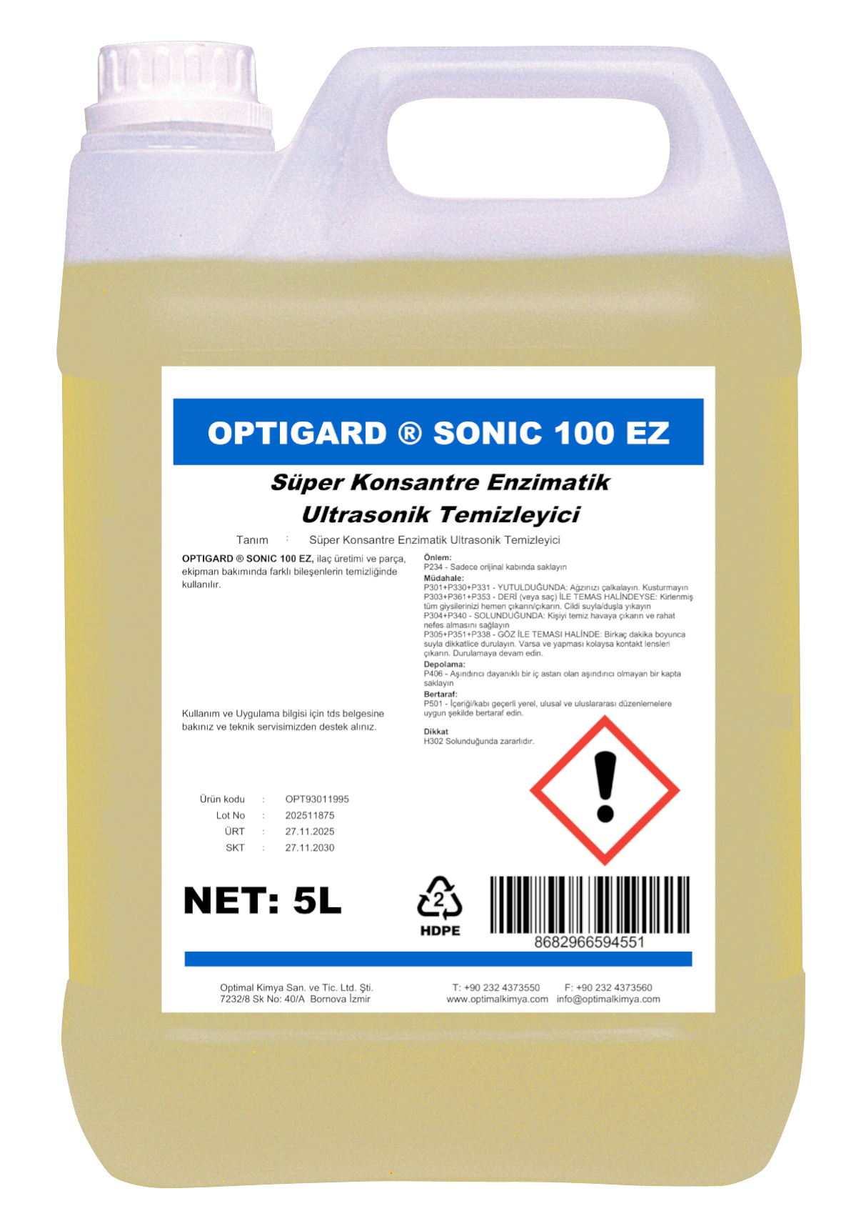 OPTIGARD ® SONIC 100 EZ, metallerin korozyonunu önlemek için korozyon inhibitörleri içeren üstün ve güçlü bir alkali temizleyicidir. Konsantre, anyonik deterjan veya manuel ve ultrasonik temizlik. Kalıntı bırakmadan güvenilir sonuçlar elde etmek için serbest durulama.