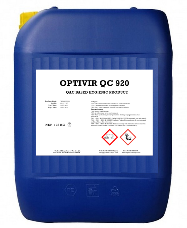 OPTIVIR QC 920, katyonik ıslatıcılar ve çözücüler içeren kuarterner amonyum bileşikleri bazlı bir dezenfektandır. Bu sıvı ve nötral mamul suda çözündüğünde hemen hemen kokusuzdur.