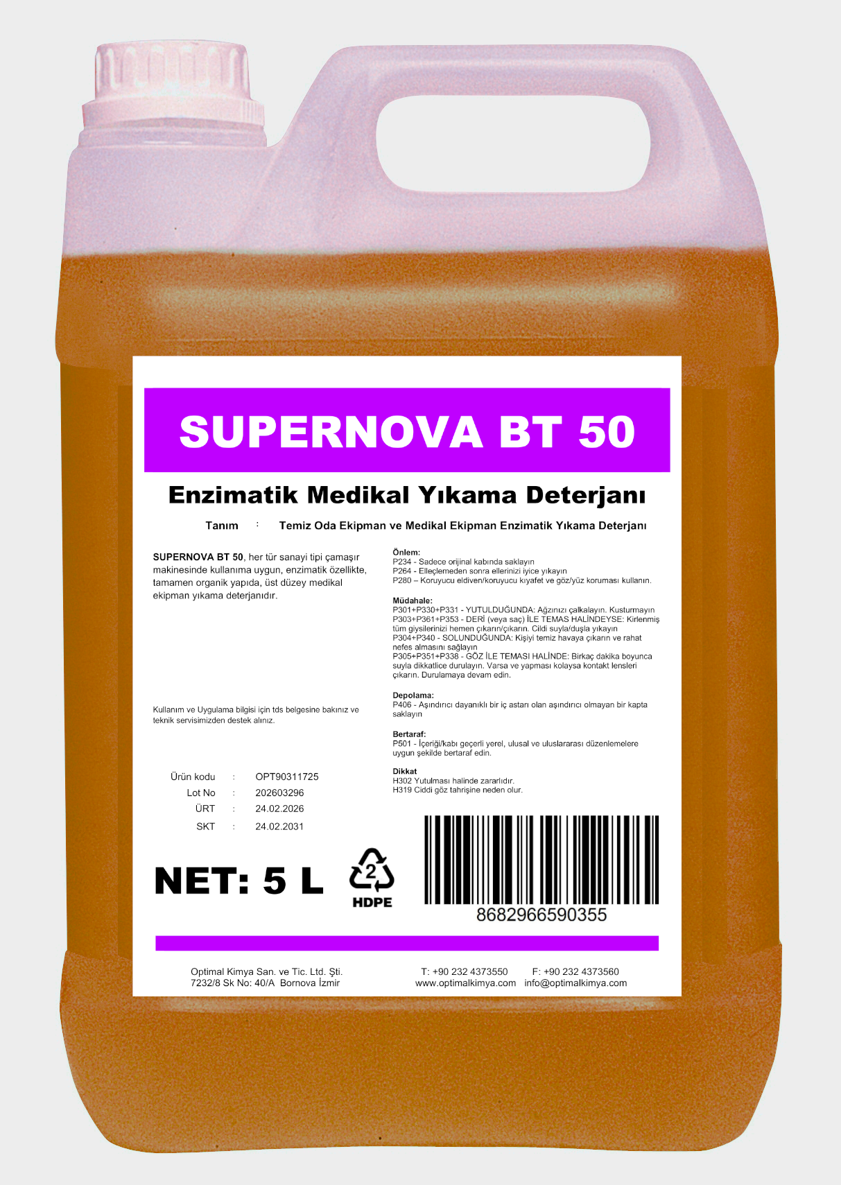 SUPERNOVA BT 50, her tür sanayi tipi çamaşır makinesinde kullanıma uygun, bitkisel esans katkılı, enzimatik özellikte, tamamen organik yapıda, üst düzey medikal ekipman yıkama deterjanıdır.